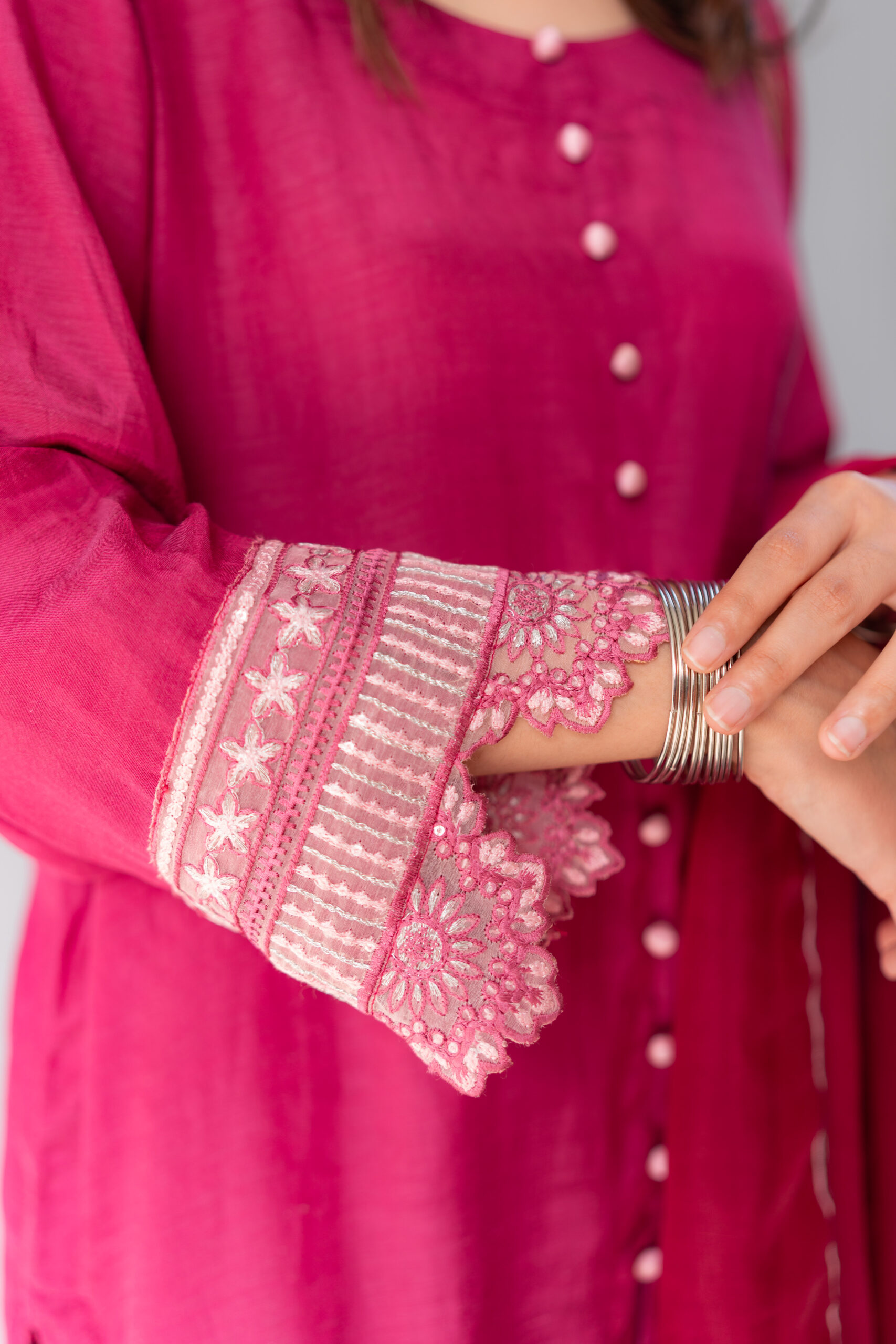 A rich berry ensemble adorned with intricate lace finishing on the sleeves and hem, paired with an embellished organza dupatta. Designed to bring bold yet graceful charm to festive occasions.